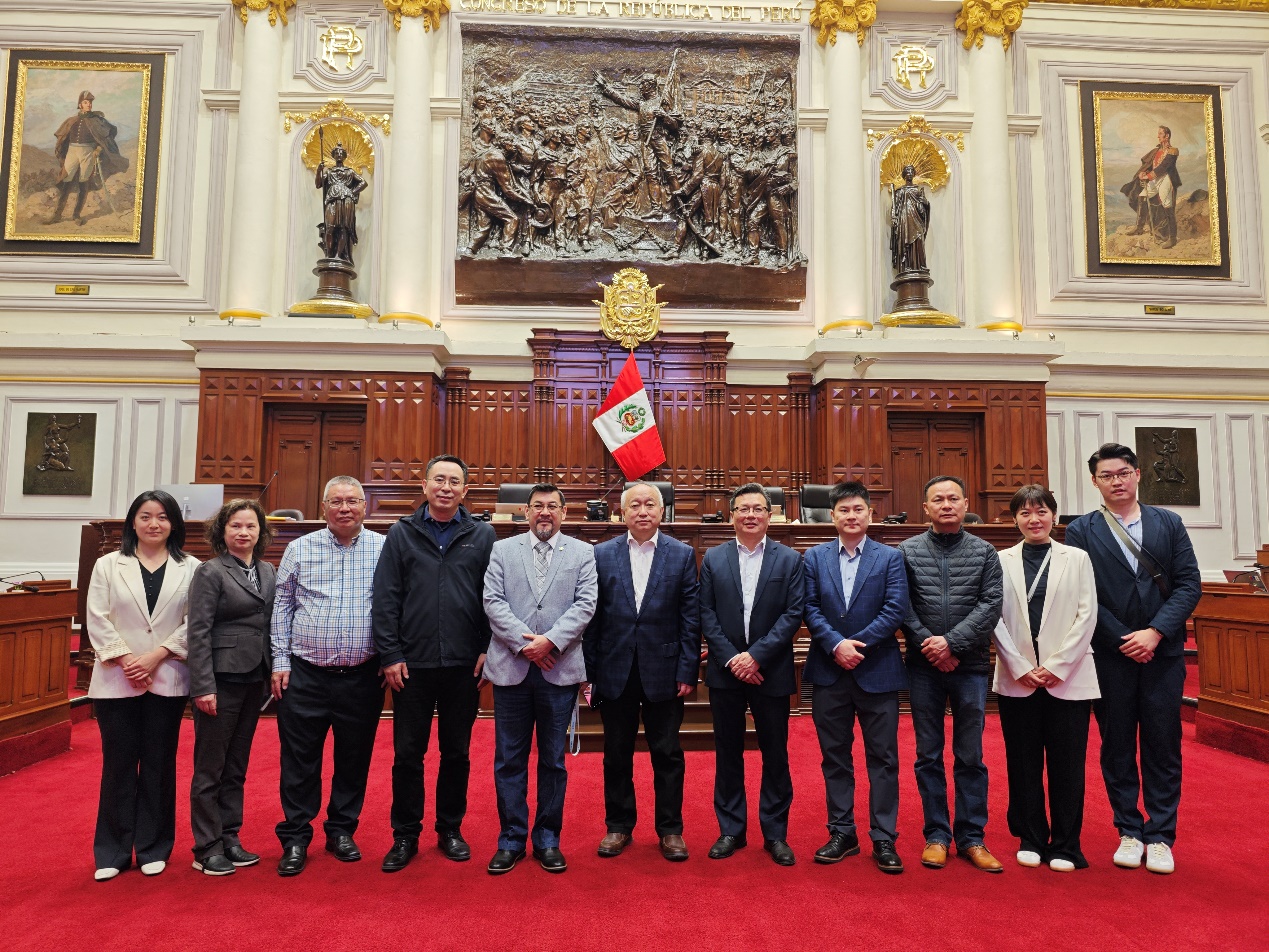 11月7日,中國新聞社采訪團一行在秘魯國會采訪秘魯國會議員兼秘中協會友好聯盟主席路易斯·科爾德羅·楊·戴(左五)。