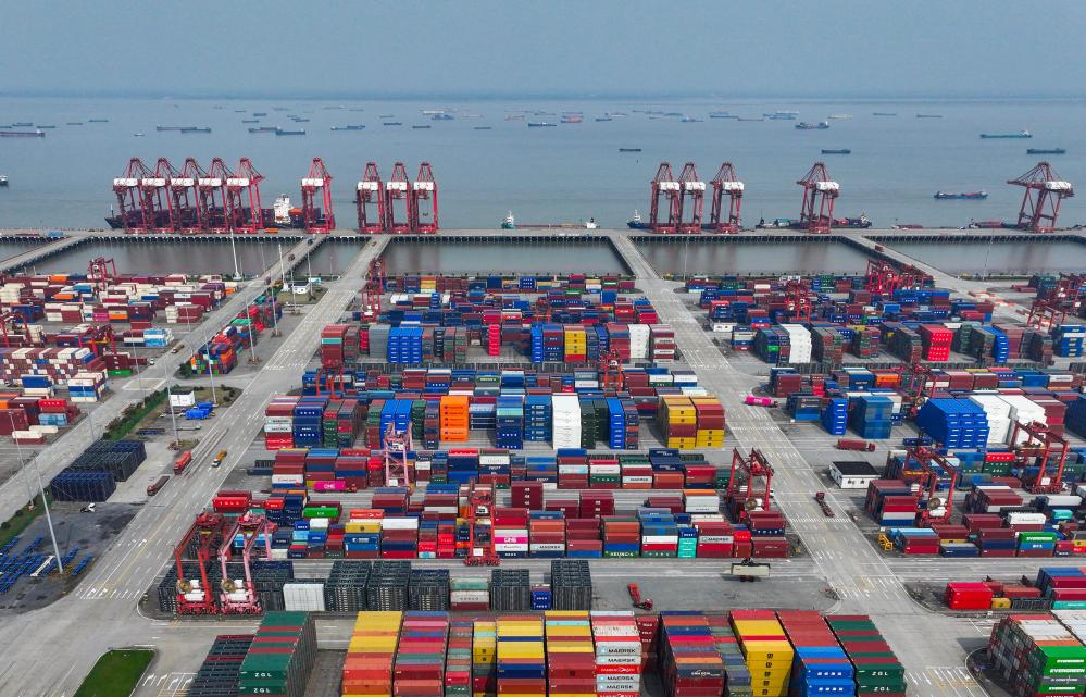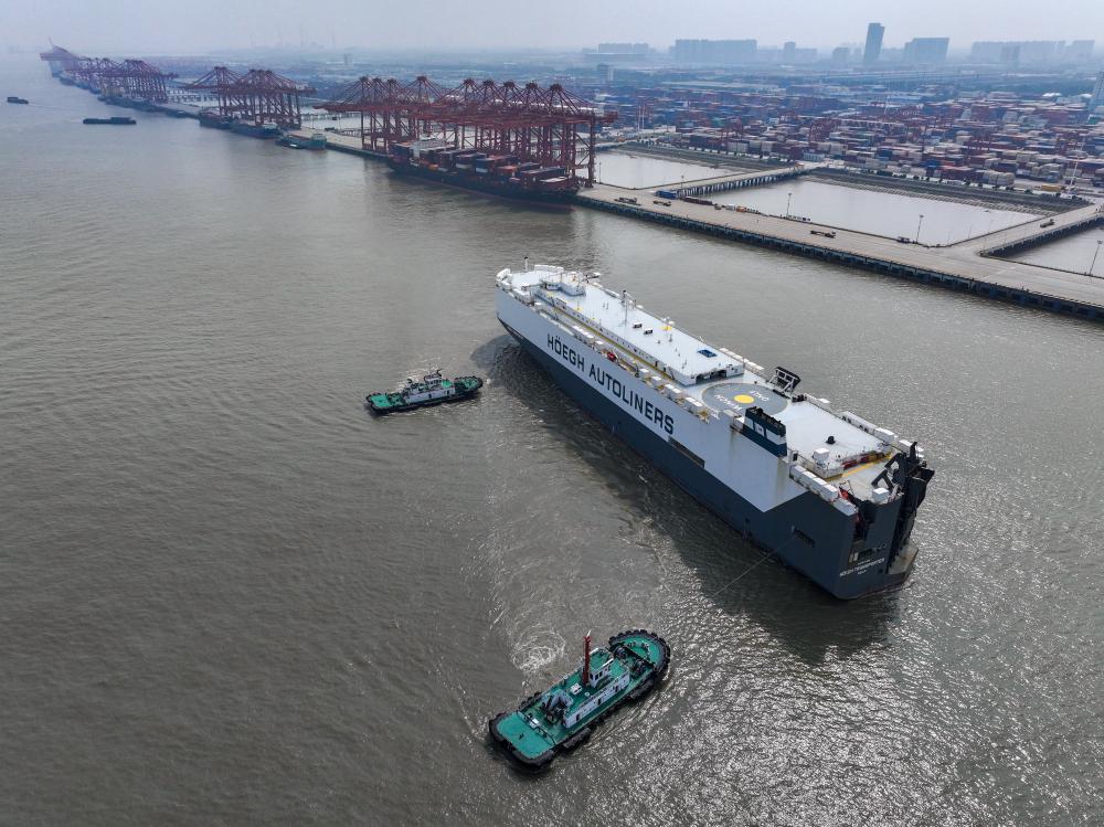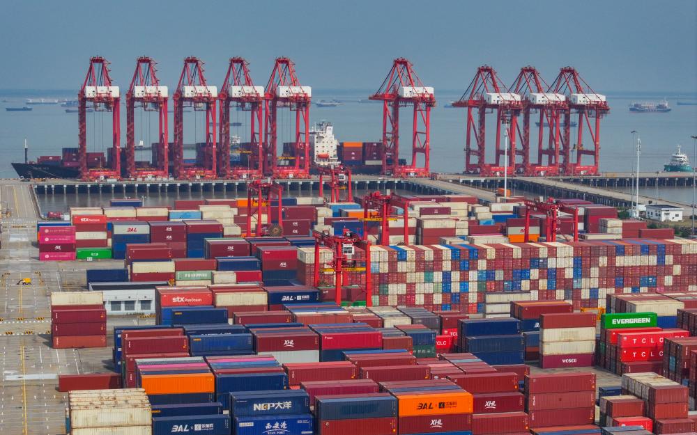 一艘貨輪駛離江蘇省蘇州港太倉港區(qū)集裝箱碼頭(無人機照片,10月10日攝)。新華社記者 李博 攝