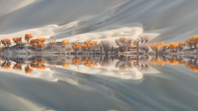 近日,新疆尉犁縣羅布湖風(fēng)景游覽區(qū)。羅布湖宛如一面明鏡,映照出周?chē)吧牡褂?,綿延的沙丘、金色的胡楊、碧藍(lán)的天空,與湖面的鏡像世界構(gòu)成一幅絕美的自然畫(huà)卷。