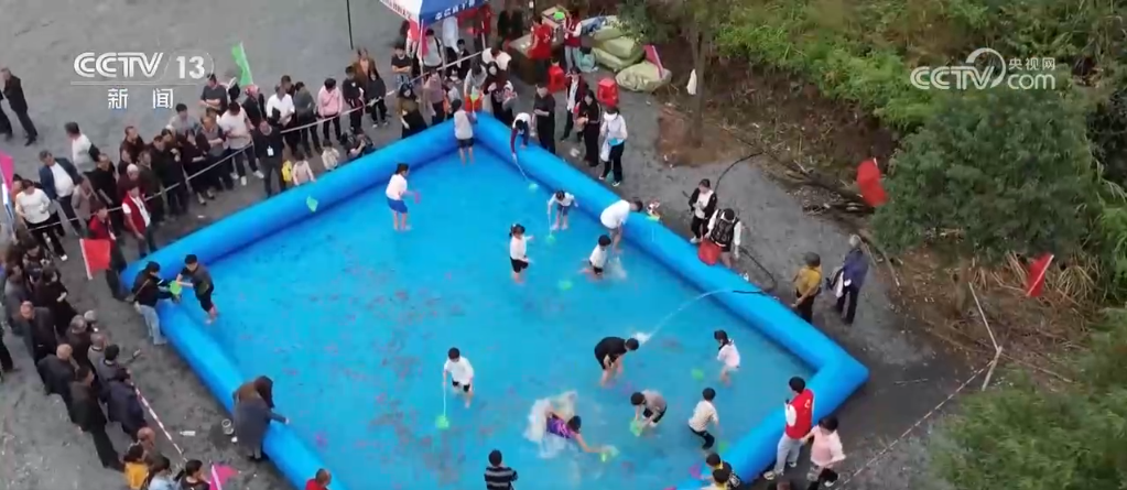 在捕魚現(xiàn)場,當(dāng)?shù)剡€設(shè)立了捕魚體驗(yàn)區(qū),大人們協(xié)力拉緊繩索收攏大網(wǎng),體驗(yàn)豐收的喜悅;小朋友們也擼起袖子,挽起褲腿用網(wǎng)撈魚,沉浸式體驗(yàn)捕魚的樂趣。