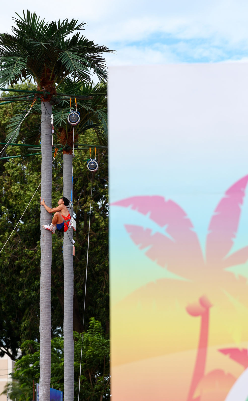 相比在運動會上歷史悠久的龍舟,當(dāng)日上演的攀椰競速則是在本屆賽事首次撞入人們的眼簾。在椰子樹上手腳并用攀爬,迅速抵達(dá)頂端,不問可知,這一競技性與趣味性兼具的運動脫胎于海南當(dāng)?shù)厝罕妭鹘y(tǒng)的徒手爬樹摘椰子場景。
