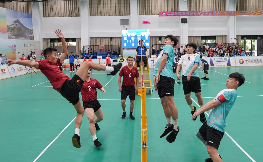 11月24日,第十二屆全國少數(shù)民族傳統(tǒng)體育運(yùn)動會毽球男子三人小組賽在海南省三亞市舉行,圖為天津隊和廣西隊比賽現(xiàn)場。新華社記者 晉美多吉 攝