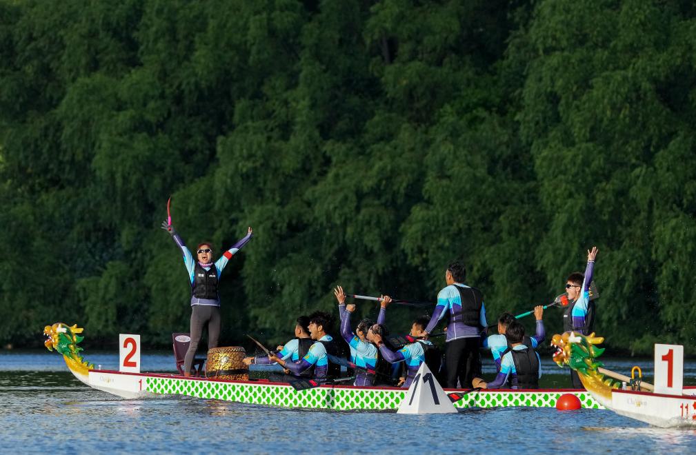 11月25日,云南隊(duì)在決賽后慶祝。最終云南隊(duì)獲得一等獎。當(dāng)日,第十二屆全國少數(shù)民族傳統(tǒng)體育運(yùn)動會混合組(小龍舟)500米直道賽在海南省三亞市舉行。新華社發(fā)(杜笑微攝)