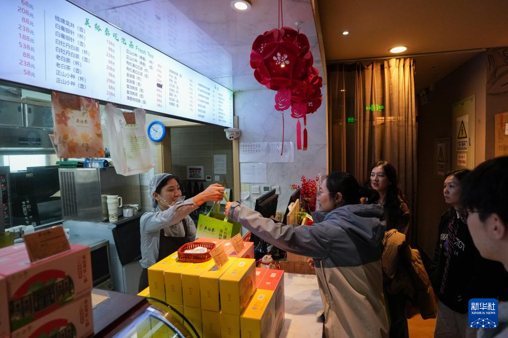 在位于北京前門大街的吳裕泰茶莊,工作人員(左一)將茶餅干遞到顧客手中(11月15日攝)。新華社記者 鞠煥宗 攝