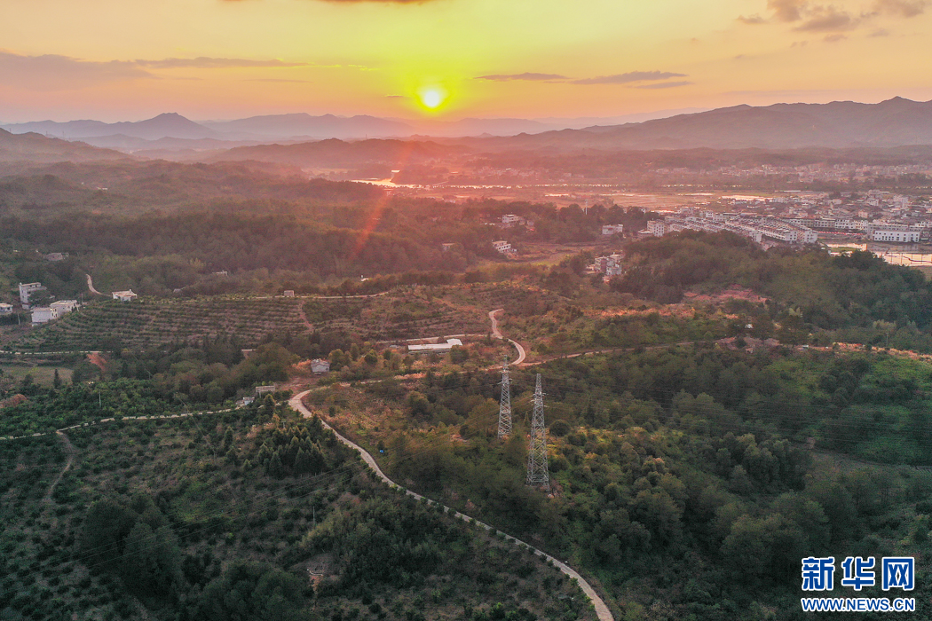 這是在長(zhǎng)汀縣三洲鎮(zhèn)豐盈美麗生態(tài)農(nóng)場(chǎng)拍攝到的落日景觀。如今,這里月月有花開,季季有果采,昔日“火焰山”變成了“花果山”(無人機(jī)照片)。新華網(wǎng) 肖和勇 攝