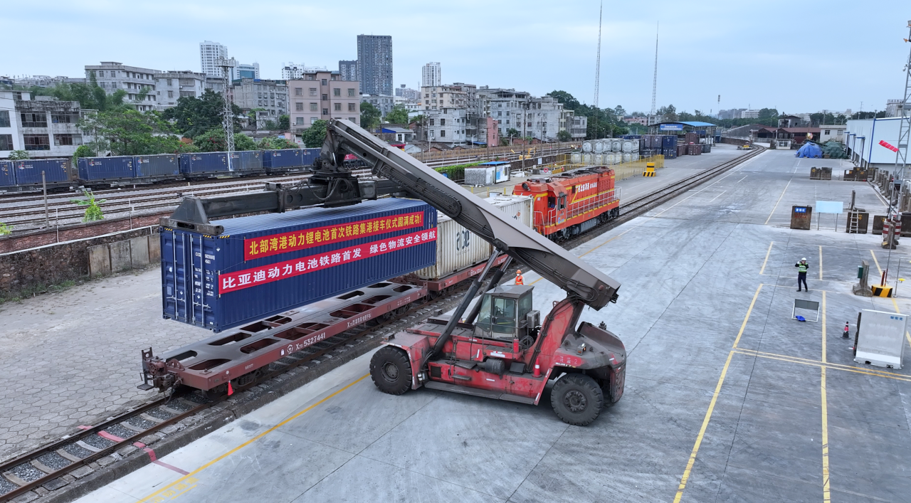 11月19日,一列載著比亞迪新能源動(dòng)力鋰電池的列車,從重慶長(zhǎng)壽區(qū)渝巴專用鐵路發(fā)車,沿著西部陸海新通道南下,于22日駛?cè)霃V西北部灣防城港新宏光鐵路專用線。隨著接卡作業(yè)的完成,全國(guó)首次鐵路發(fā)運(yùn)動(dòng)力鋰電池在北部灣港順利接卸。