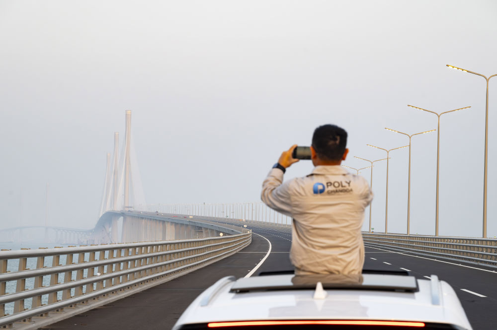 12月7日,一位工程建設(shè)者在黃茅海跨海通道上拍照留念。新華社記者 才揚(yáng) 攝