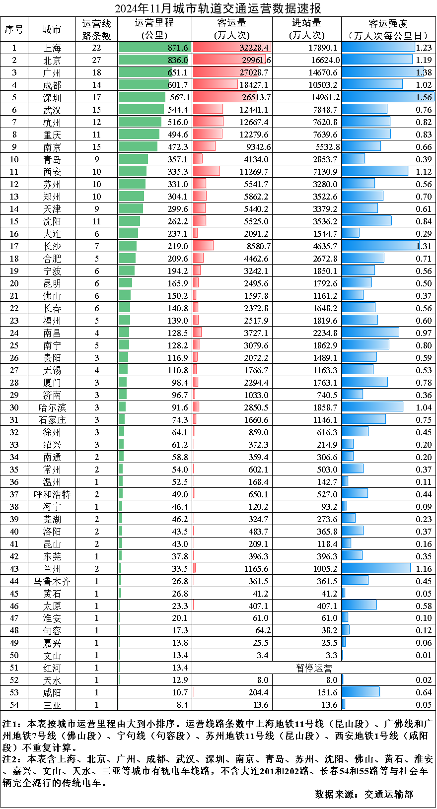 交通運輸部發(fā)布消息,2024年11月,31個省(自治區(qū)、直轄市)和新疆生產建設兵團共有54個城市開通運營城市軌道交通線路313條,運營里程10522.1公里,實際開行列車340萬列次,完成客運量27.1億人次,進站量16.2億人次。11月份,客運量環(huán)比減少0.6億人次,降低2.2%,同比增加1.3億人次,增長5.2%。11月份全國總運營里程的平均客運強度為0.860萬人次每公里日,環(huán)比增長0.8%,同比增長1.9%。