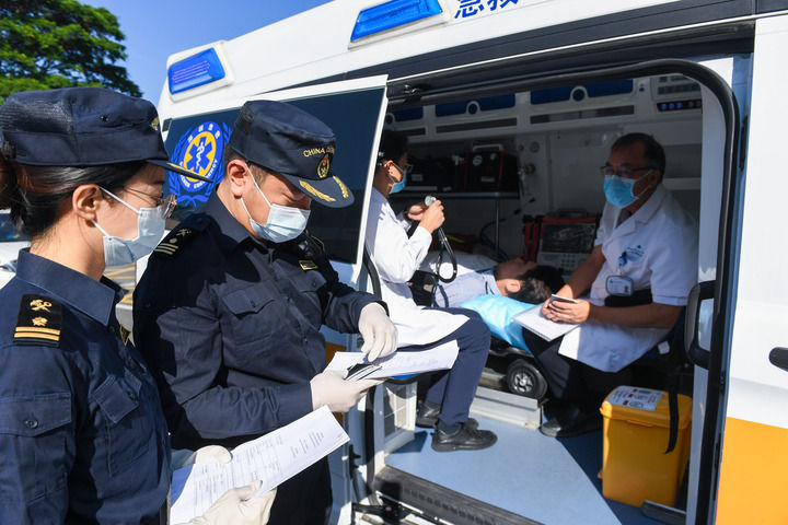 在深圳灣口岸深圳一側(cè),海關(guān)工作人員對參加第二次粵港跨境直通救護(hù)車演練的救護(hù)車進(jìn)行出境前的查驗(yàn)(2024年10月31日攝)。新華社記者 毛思倩 攝