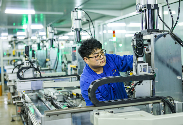 2024年12月12日,在山東省榮成市一家燃?xì)庥?jì)量儀表制造企業(yè)的智能化生產(chǎn)車間內(nèi),維修工人在進(jìn)行設(shè)備調(diào)試。新華社發(fā)(李信君攝)