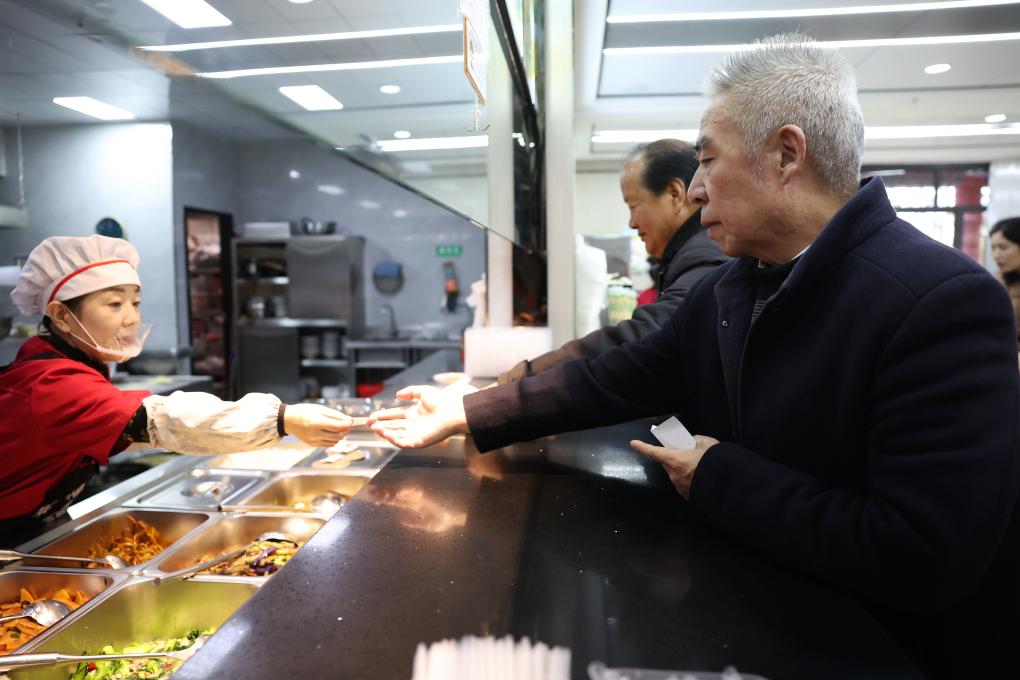 11月22日,在華亭市東華鎮(zhèn)東華綜合養(yǎng)老服務中心,老人在餐廳窗口打飯。新華社記者 陳斌 攝