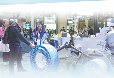 第七屆中國國際進(jìn)口博覽會(huì)上,觀眾正在了解米其林月球探測車輪胎。 唐 克攝