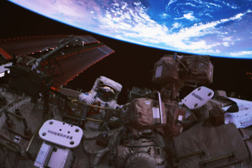 2024年7月3日在北京航天飛行控制中心拍攝的神舟十八號航天員李聰出艙的畫面。