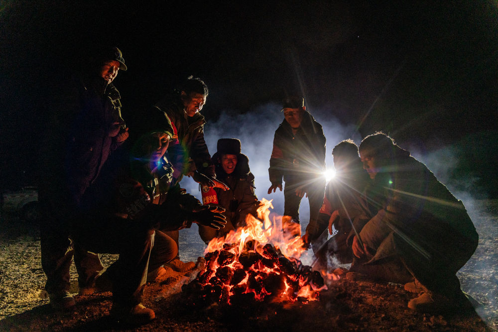 2024年5月10日,在羌塘國家級自然保護區(qū)核心區(qū)域,野生動物專業(yè)管護隊員在宿營地里烤火,燃料是野牦牛的糞便。羌塘國家級自然保護區(qū)位于西藏自治區(qū)北部,這里的管護隊員常年頂風(fēng)冒雪,穿越無人區(qū)進行巡護。