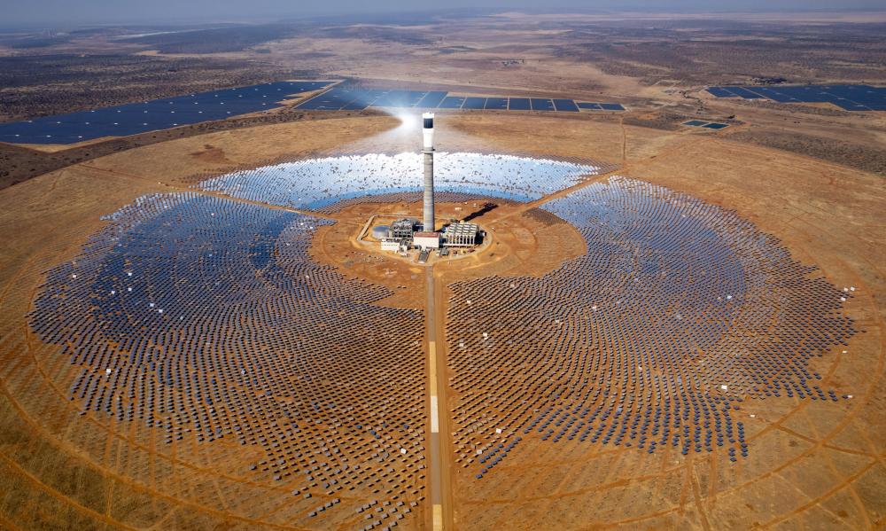 這是2024年8月20日在南非北開普省拍攝的南非紅石100兆瓦塔式熔鹽光熱電站項(xiàng)目(無人機(jī)照片)。新華社記者 張譽(yù)東 攝