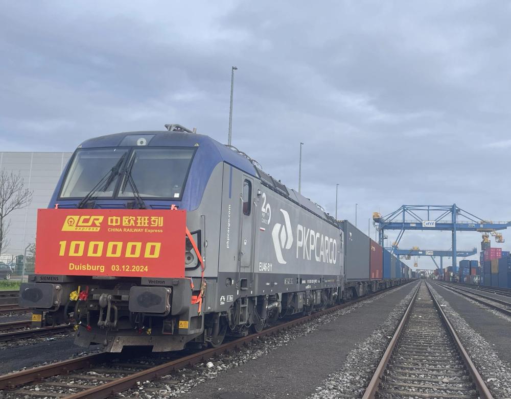 這是2024年12月3日在德國杜伊斯堡市DIT場站拍攝的第10萬列中歐班列。新華社 朱璇 攝
