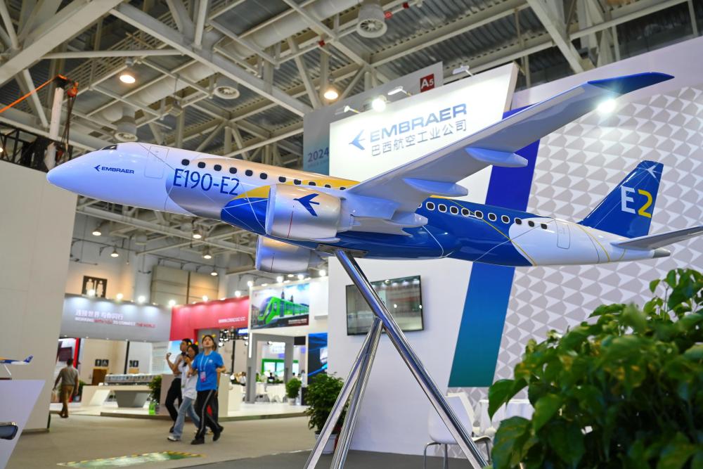 這是在廈門舉行的2024金磚國家新工業(yè)革命展巴西展位展出的E190-E2飛機(jī)模型(2024年9月10日攝)。新華社記者 林善傳 攝