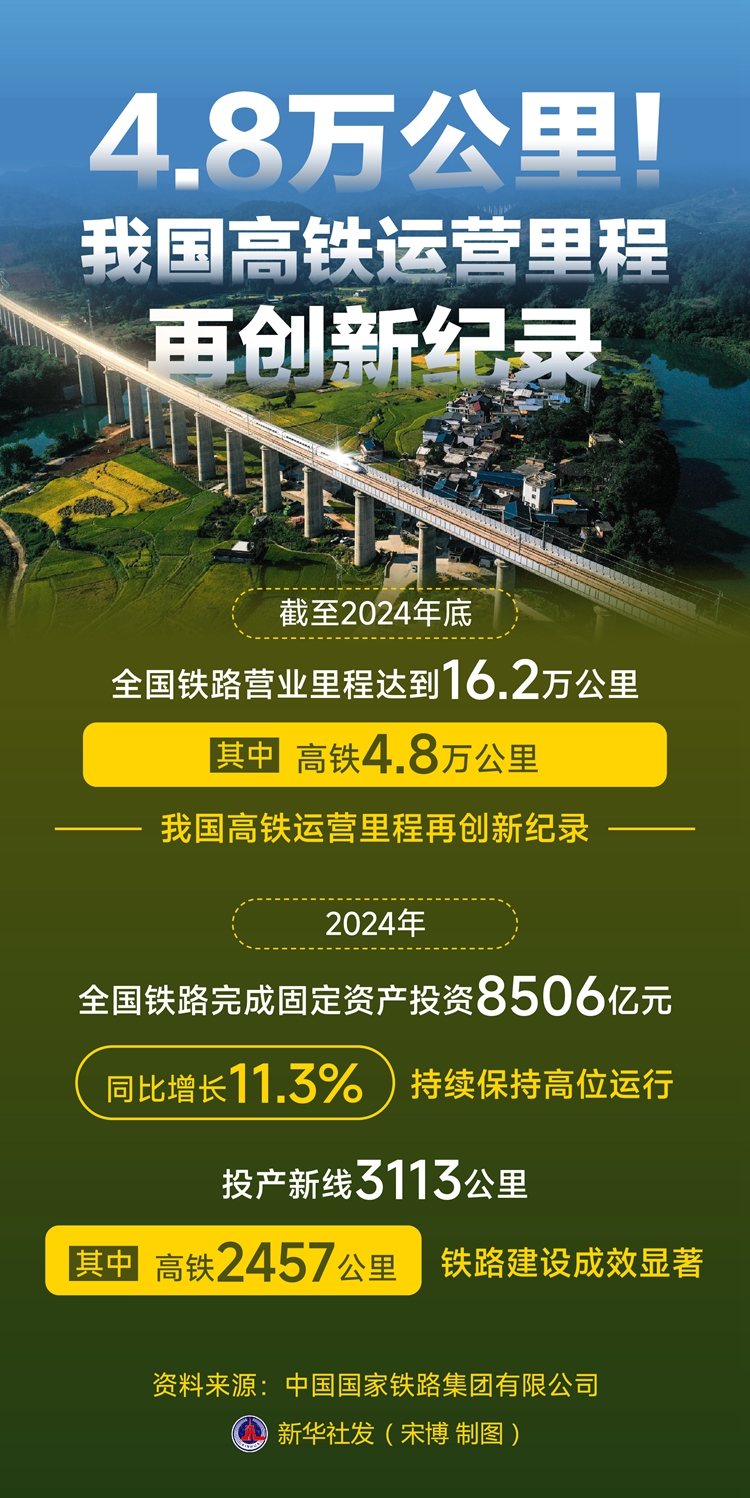 2日,中國(guó)國(guó)家鐵路集團(tuán)有限公司召開工作會(huì)議。會(huì)議發(fā)布的最新統(tǒng)計(jì)數(shù)據(jù)顯示,截至2024年底,全國(guó)鐵路營(yíng)業(yè)里程達(dá)到16.2萬(wàn)公里,其中高鐵4.8萬(wàn)公里,我國(guó)高鐵運(yùn)營(yíng)里程再創(chuàng)新紀(jì)錄。