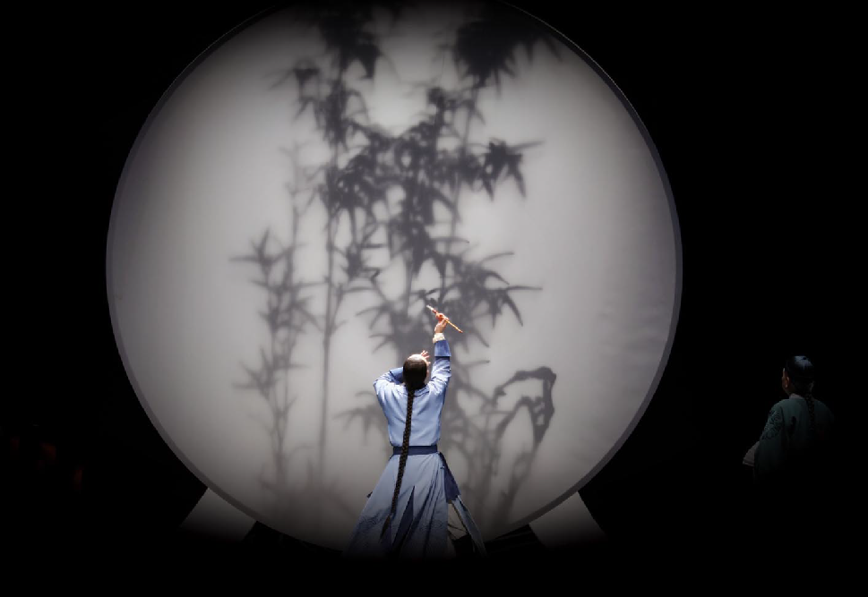舞臺上,古琴與琵琶的悠揚(yáng)旋律仿若一陣清風(fēng),輕輕拂開歷史的畫卷,清代揚(yáng)州的風(fēng)情萬種如詩如畫般徐徐展開。鄭板橋筆下的竹、蘭、石化作他性格的三種特質(zhì),生動地展現(xiàn)了為官之德、書生之質(zhì)、為民之心,以及他對生命價值的執(zhí)著堅守,深深地震撼著每一位觀者的心靈,讓他們沉浸其中,心潮澎湃。