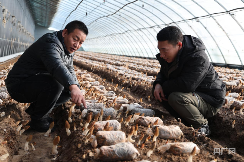 鄭福來(lái)(右)向鎮(zhèn)干部介紹羊肚菌(央廣網(wǎng)發(fā) 邵云哲 攝)