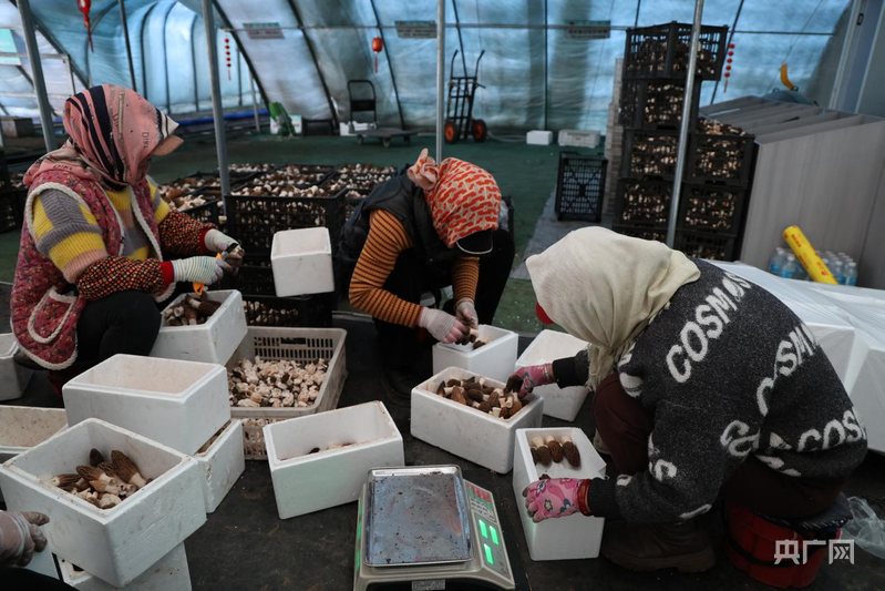 工人們將剛剛采收下來(lái)的羊肚菌剪根、裝箱(央廣網(wǎng)發(fā) 畢樂(lè)陶 攝)