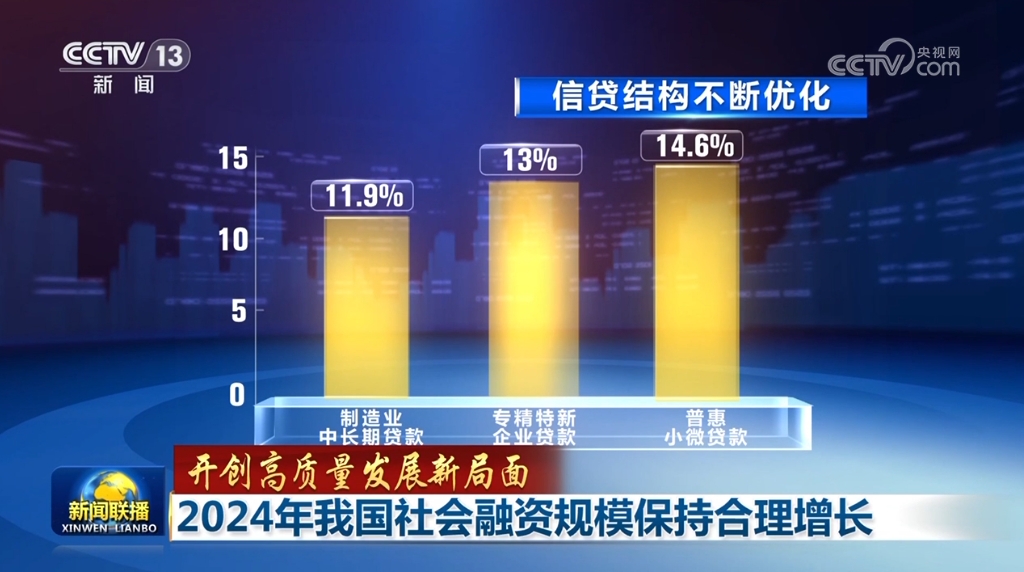 中國人民銀行相關(guān)負(fù)責(zé)人介紹,2024年12月末,社會(huì)融資規(guī)模存量為408.34萬億元,其中,對實(shí)體經(jīng)濟(jì)發(fā)放的人民幣貸款余額為252.53萬億元,同比增長7.2%。信貸結(jié)構(gòu)不斷優(yōu)化,制造業(yè)中長期貸款、專精特新企業(yè)貸款、普惠小微貸款增長較快,繼續(xù)高于同期全部貸款增速。