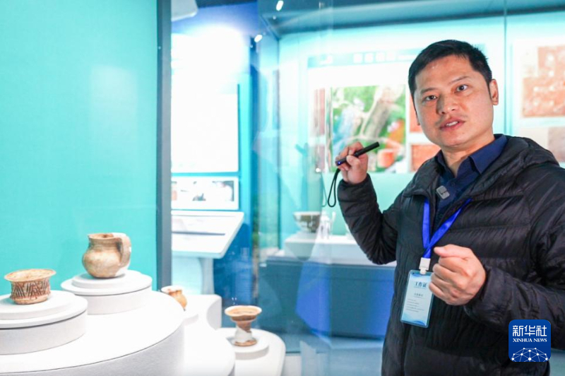 許桂榮在殼丘頭遺址博物館,向參觀者介紹文物。新華網(wǎng) 肖和勇 攝