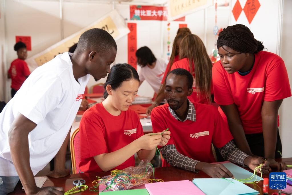 1月19日,在贊比亞首都盧薩卡舉行的春節(jié)廟會(huì)活動(dòng)上,贊比亞大學(xué)孔子學(xué)院的師生編制中國(guó)結(jié)。新華社記者 彭立軍 攝