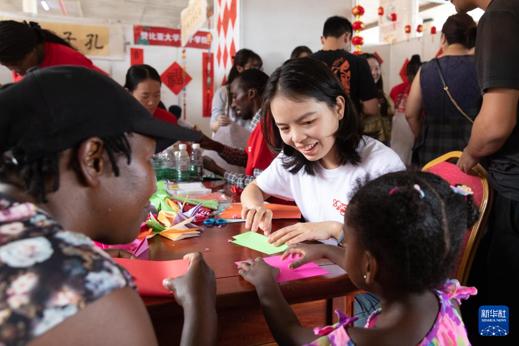 在廟會(huì)現(xiàn)場(chǎng)的贊比亞孔子學(xué)院展位前,人頭攢動(dòng)。包括書法體驗(yàn)、剪紙、折紙展示和猜字謎等豐富的文化互動(dòng)項(xiàng)目,吸引人們紛紛參與體驗(yàn)。一位贊比亞媽媽帶著孩子在老師指導(dǎo)下完成她的第一個(gè)中國(guó)結(jié)作品,她高興地說:“原來中國(guó)藝術(shù)這么有趣!希望我的孩子有一天可以去孔子學(xué)院學(xué)習(xí)?!?/p>