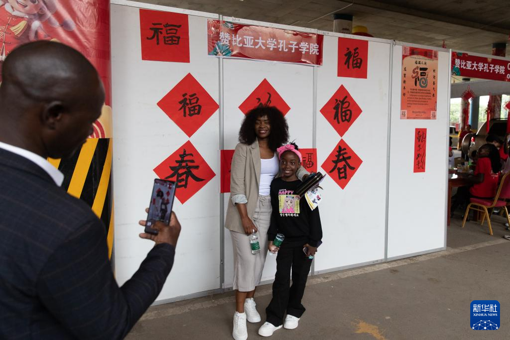 1月19日,在贊比亞首都盧薩卡舉行的春節(jié)廟會(huì)活動(dòng)上,人們?cè)谫澅葋喆髮W(xué)孔子學(xué)院的展區(qū)前合影留念。新華社記者 彭立軍 攝