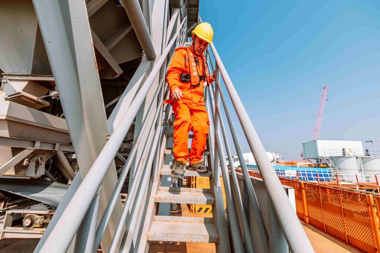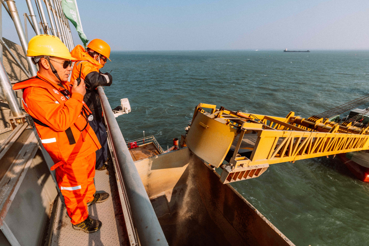 1月17日,夕陽下的廈門劉五店港區(qū),北風(fēng)勁吹。在距離中交一公局集團廈金大橋(廈門段)項目海上平臺混凝土操作員梁芝敬站立位置不到30米的洋面上,一艘船身印有“帆順168”字樣的補料船,裝載著4000多噸砂石緩緩抵近。船頭前方延伸出一條25米長的傳送皮帶,將船上的砂料源源不斷地送抵老梁眼前的鋼制固料斗內(nèi)。當天他們要趁著海水退潮帶來的作業(yè)窗口,為站里補上700噸機制砂和900噸粒徑10到20毫米的小石子,以確?;炷琳旧a(chǎn)不停機。