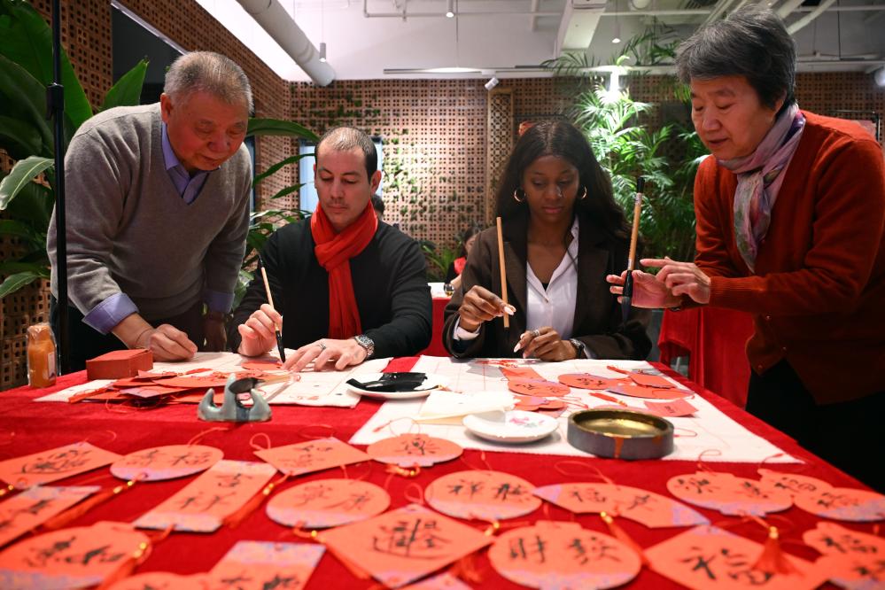 1月17日,外國人在大聯(lián)歡活動中體驗書法。當日,“春暖朝陽·巳巳如意”中外居民大聯(lián)歡新時代文明實踐活動在北京朝陽區(qū)左家莊街道舉行。新華社記者 金良快 攝