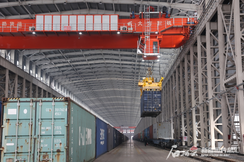 “轟隆轟隆……”室內(nèi),一列列裝滿貨物的列車,從阿拉山口站集裝箱換裝庫有序地駛進(jìn)又駛出。