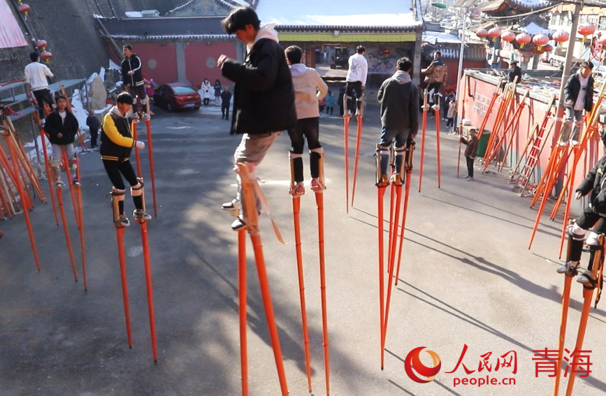 綁蹺、試蹺、定蹺……青海省西寧市湟中區(qū)魯沙爾鎮(zhèn)火神廟,魯沙爾高蹺隊(duì)迎來了春節(jié)前最后一次排練?!皬呐D月初一到現(xiàn)在二十多天了,今年大家積極性很高,報(bào)名的人也多,排練效果不錯(cuò)。”做好準(zhǔn)備,隨著社火音樂的鼓點(diǎn)舞動起來,魯沙爾鎮(zhèn)高蹺協(xié)會會長李玉龍站在臺階上看著排練隊(duì)形。