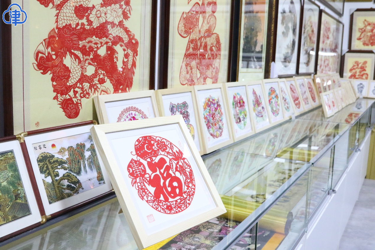 在戲樓對(duì)面,楊柳青剪紙世家第四代傳人,郝桂芬的剪紙鋪吸引了眾多游客的駐足。郝桂芬既是店鋪的“當(dāng)家人”,也是非遺剪紙項(xiàng)目的代表性傳承人。楊柳青剪紙的技法,既需要用北方剪刀剪出輪廓,又需要用南方刻刀雕飾細(xì)節(jié)。郝桂芬的獨(dú)門絕技——染色剪紙,是先用白紙剪出樣式,再用楊柳青年畫(huà)的技法上色。她的剪紙作品包括花鳥(niǎo)魚(yú)蟲(chóng)、神話故事、喜慶吉祥圖案等,深受游客喜愛(ài)。在這里,游客們不僅可以購(gòu)買到精美的剪紙作品,還能在學(xué)習(xí)體驗(yàn)剪紙技法,感受指尖上的古老藝術(shù)。