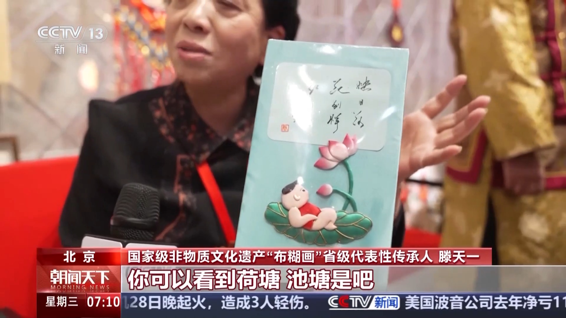 北京國家級非物質(zhì)文化遺產(chǎn)“布糊畫”省級代表性傳承人 滕天一:很多手工掛件做完了到不了一分鐘就買走了。從古到今幾千年了,我們中國的東西到哪兒你細看,它是有內(nèi)涵的東西。比如說我拿了楊萬里的一句詩“映日荷花別樣紅”你可以看到荷塘、池塘是吧,再想到我們的詩、詩人,它都是有意境的。