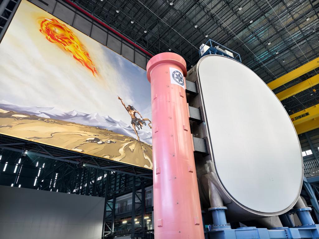 在11號(hào)廠房,墻壁上高達(dá)十幾米的夸父逐日畫像,襯托著一座形似“橘子瓣”的巨大腔體,讓科技藍(lán)為主色調(diào)的空間里有了活躍的神韻。未來,八個(gè)這樣的“橘子瓣”合而為一,下一代“人造太陽”將在里頭進(jìn)行“燃燒”實(shí)驗(yàn)。