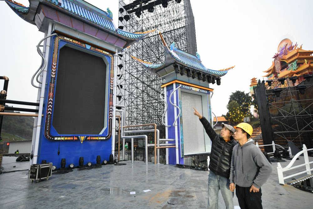 在第31屆自貢國際恐龍燈會主舞臺現(xiàn)場,萬松濤(左)與工作人員商討細(xì)節(jié),確保最終的呈現(xiàn)效果(1月14日攝)。