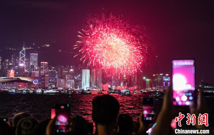 20時20分左右,煙花匯演進(jìn)入終章《瑞蛇豐年》,在背景音樂《金蛇狂舞》聲中,“游星”煙花直奔夜空,形成“靈蛇狂舞”的壯觀景象。隨后,所有躉船將剩余煙花密集燃放,維港夜空霎時流光溢彩,與摩天大樓的現(xiàn)代夜景交相輝映。
