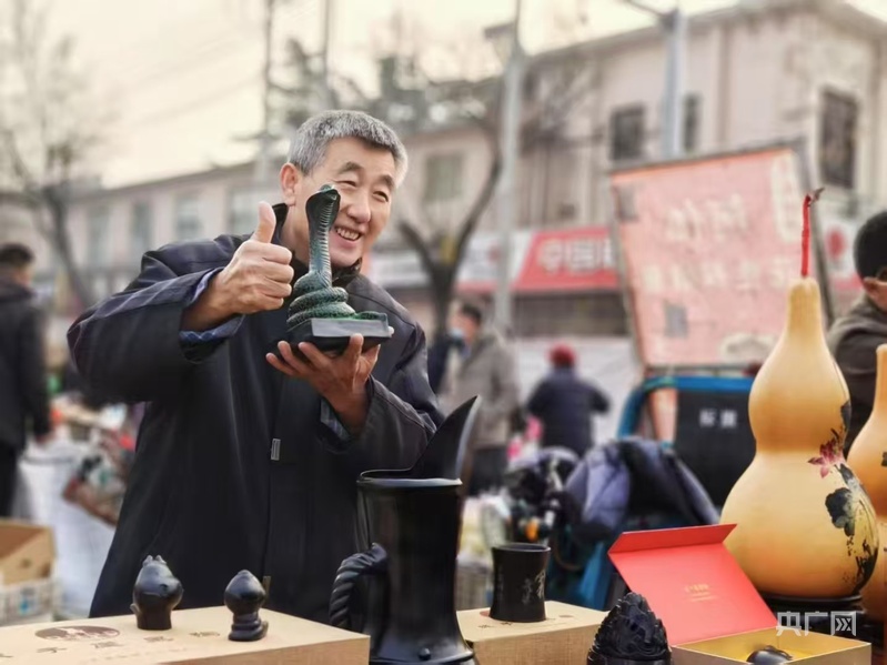 非遺項(xiàng)目章丘黑陶傳承人張國(guó)慶展示蛇年擺件(央廣網(wǎng)發(fā) 孟凡庚 攝)