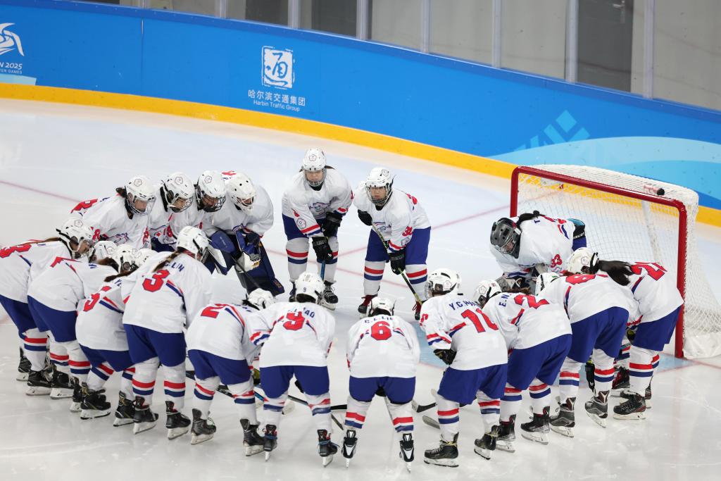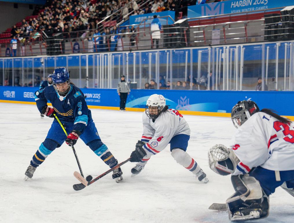 2月6日,在哈爾濱體育學(xué)院舉行的2025年第九屆亞冬會(huì)女子冰球小組賽B組比賽中,中國(guó)臺(tái)北隊(duì)1:5不敵哈薩克斯坦隊(duì)。新華社記者 孫非 攝