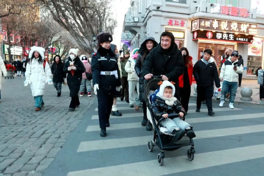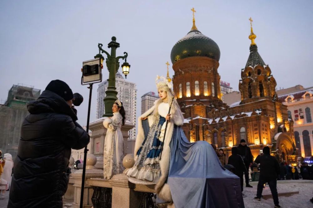 游客在哈爾濱建筑藝術(shù)廣場(chǎng)盛裝拍攝寫(xiě)真。