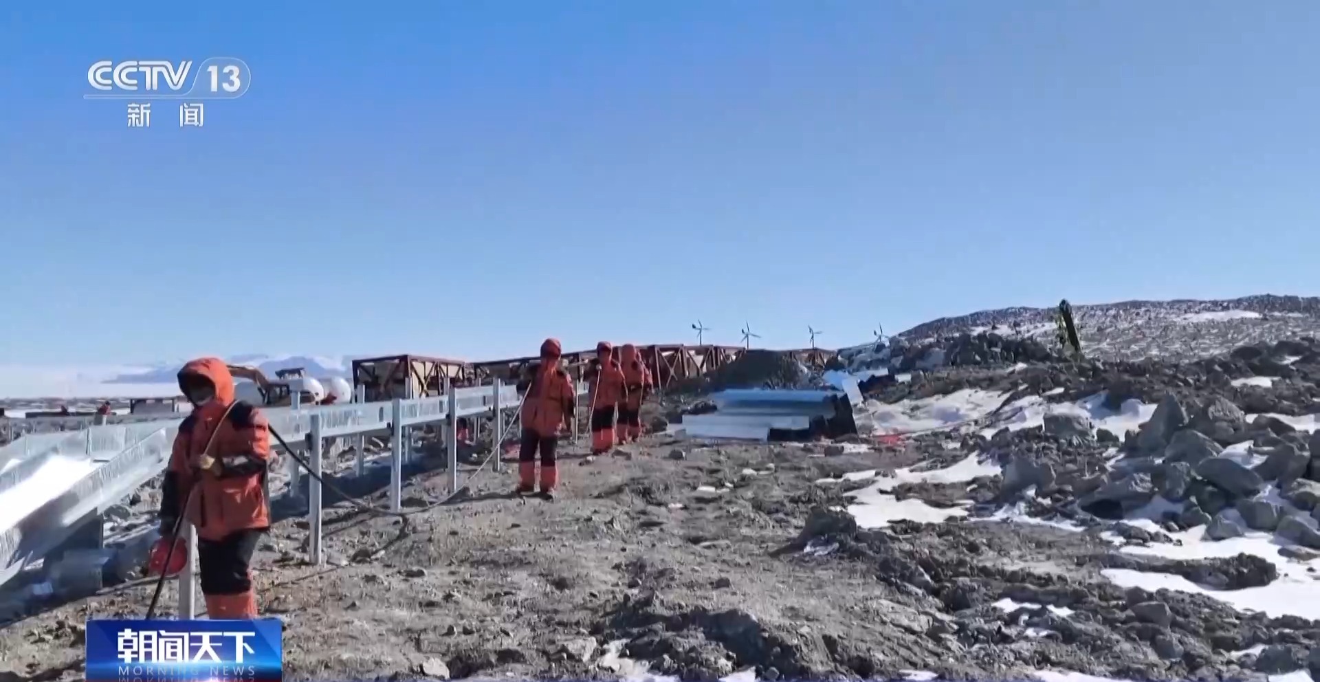 中國第41次南極考察隊秦嶺站站長 王哲超:我身后就是秦嶺站新能源體系中的風力發(fā)電和光伏發(fā)電。目前我們已經完成了10個風機的安裝,現在正在安裝的是光伏支架還有光伏板。
