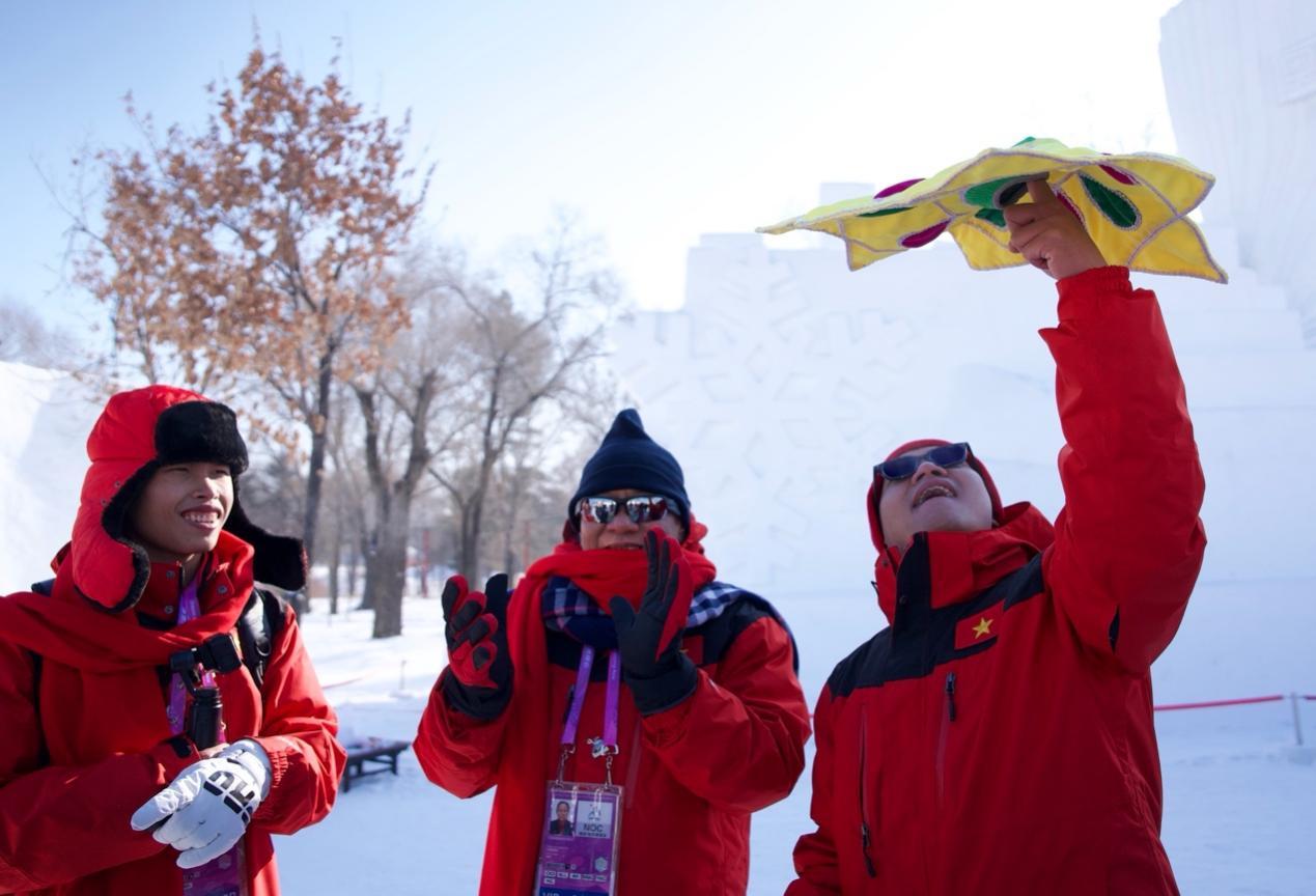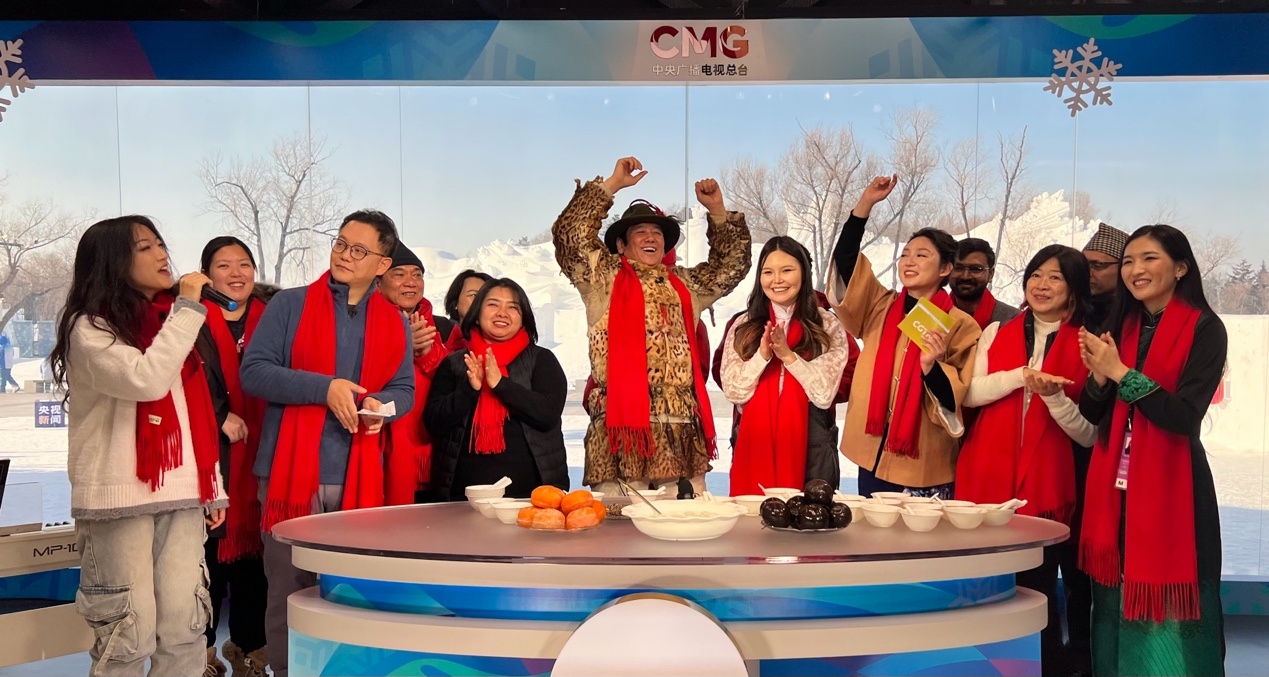 來自蒙古國、泰國、菲律賓、越南、印度、尼泊爾等國的近20位運動員、體育代表團官員和媒體人,在賽場上比拼之后,歡聚在哈爾濱太陽島雪博會中央廣播電視總臺的演播室,在冰天雪地中共慶新春。