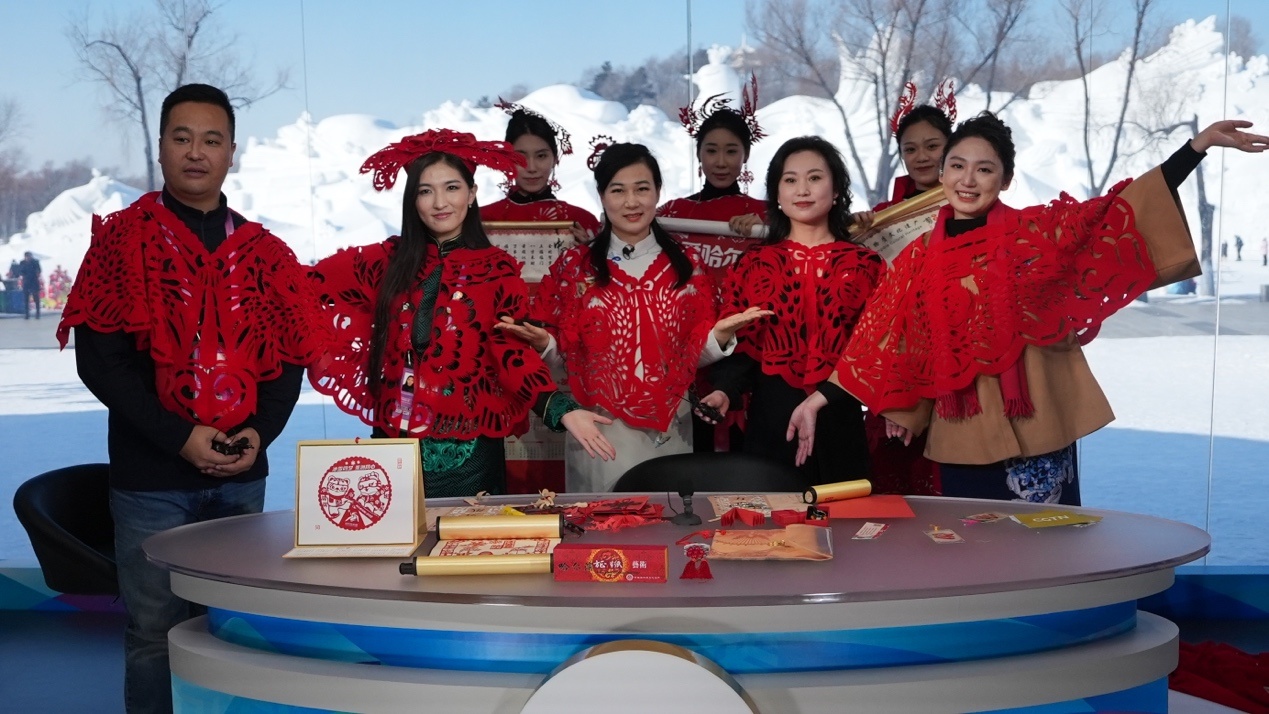 參加“當亞冬會遇上‘非遺年’”人文交流活動的中外嘉賓在哈爾濱太陽島雪博會CMG演播室同慶新春