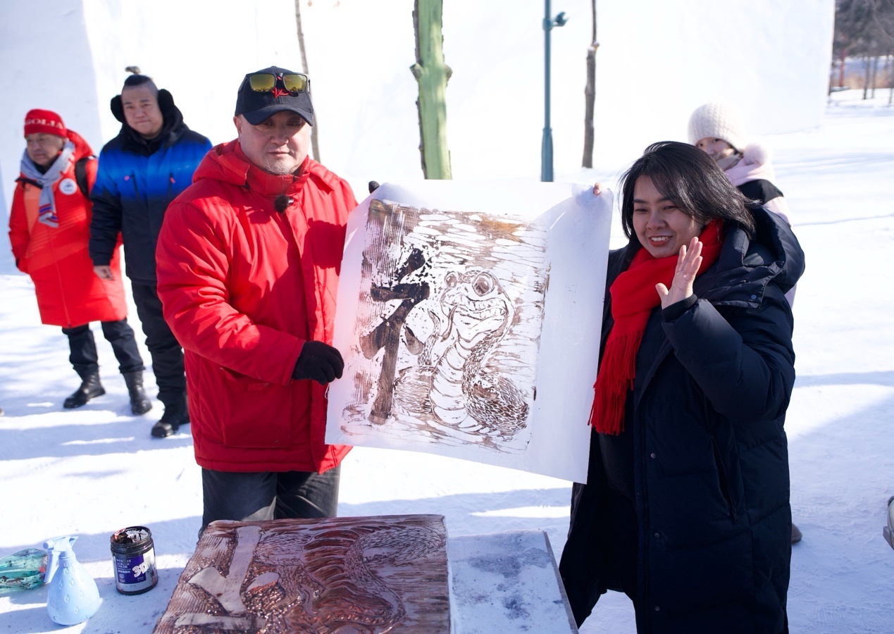泰國駐華大使館二等秘書王安安在黑龍江省藝術研究院冰版畫研究院副院長盛琰的指導下,制作出冰版畫《畫蛇添?!罚蒙叩男螤詈蜐h字的偏旁部首組合雕刻出漢字“?!辈⑼赜〕鰜?,寄托對中國農(nóng)歷蛇年的祝福。