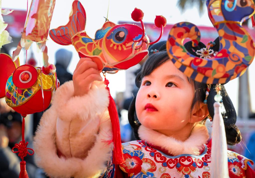 2月9日,一名小朋友在浙江省寧波市寧海縣強蛟鎮(zhèn)峽山村迎元宵節(jié)活動中專注賞燈。新華社發(fā)(胡學(xué)軍攝)