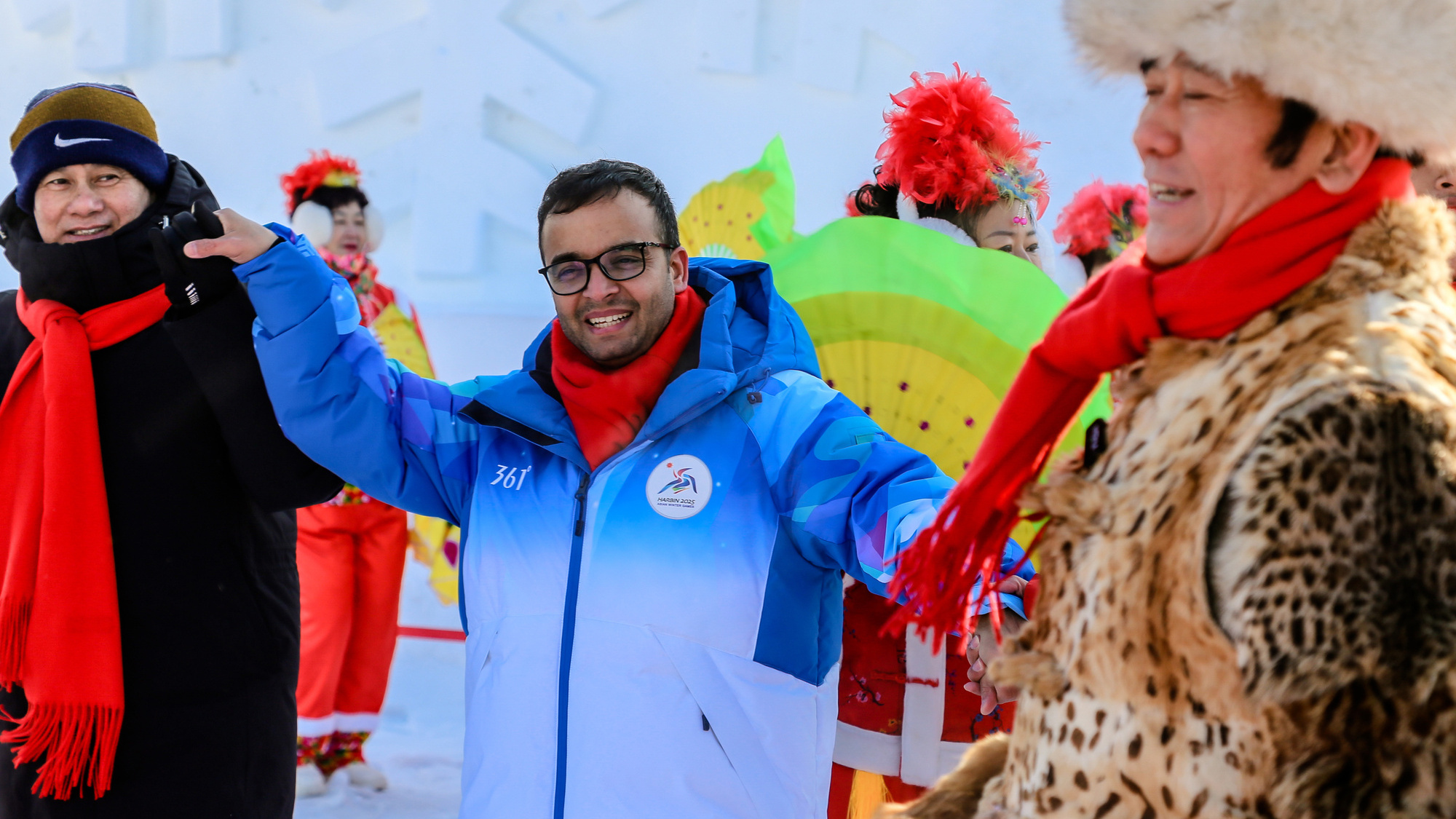 第九屆亞冬會在哈爾濱舉辦期間,一場主題為“當(dāng)亞冬會遇上非遺年——亞洲多國人士冰城同慶新春”的人文交流活動在哈爾濱舉行。活動當(dāng)天,在哈爾濱雪博會中央廣播電視總臺演播室前的廣場上,20多人組成的民間秧歌隊在哈爾濱中央大街形象大使甲繼海的帶領(lǐng)下,為各國來賓激情演繹迎賓秧歌舞。