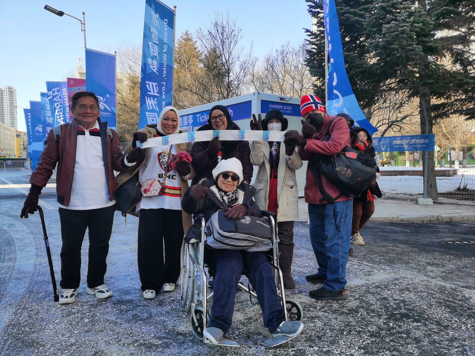 阿伊莎(后排左二)一家六口在亞冬會(huì)賽場(chǎng)外合影