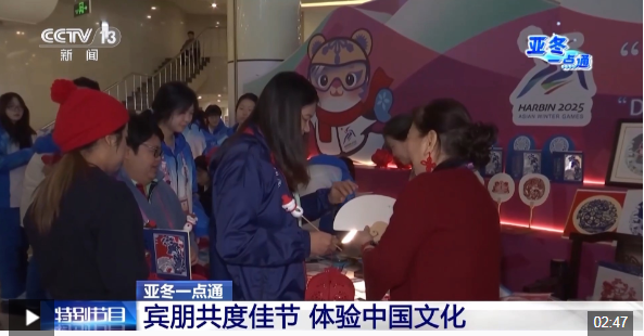 總臺(tái)央視記者 王晨:我現(xiàn)在是在位于哈爾濱亞冬會(huì)運(yùn)動(dòng)員村的一樓展廳,這里正在舉行“冰雪同夢(mèng)·亞洲同心”非物質(zhì)文化遺產(chǎn)展示活動(dòng)。今天是開幕式后的第五個(gè)比賽日,展示活動(dòng)持續(xù)進(jìn)行中,有金漆技藝、方正剪紙、木雕重彩、皮影戲等非遺代表性項(xiàng)目展臺(tái)。